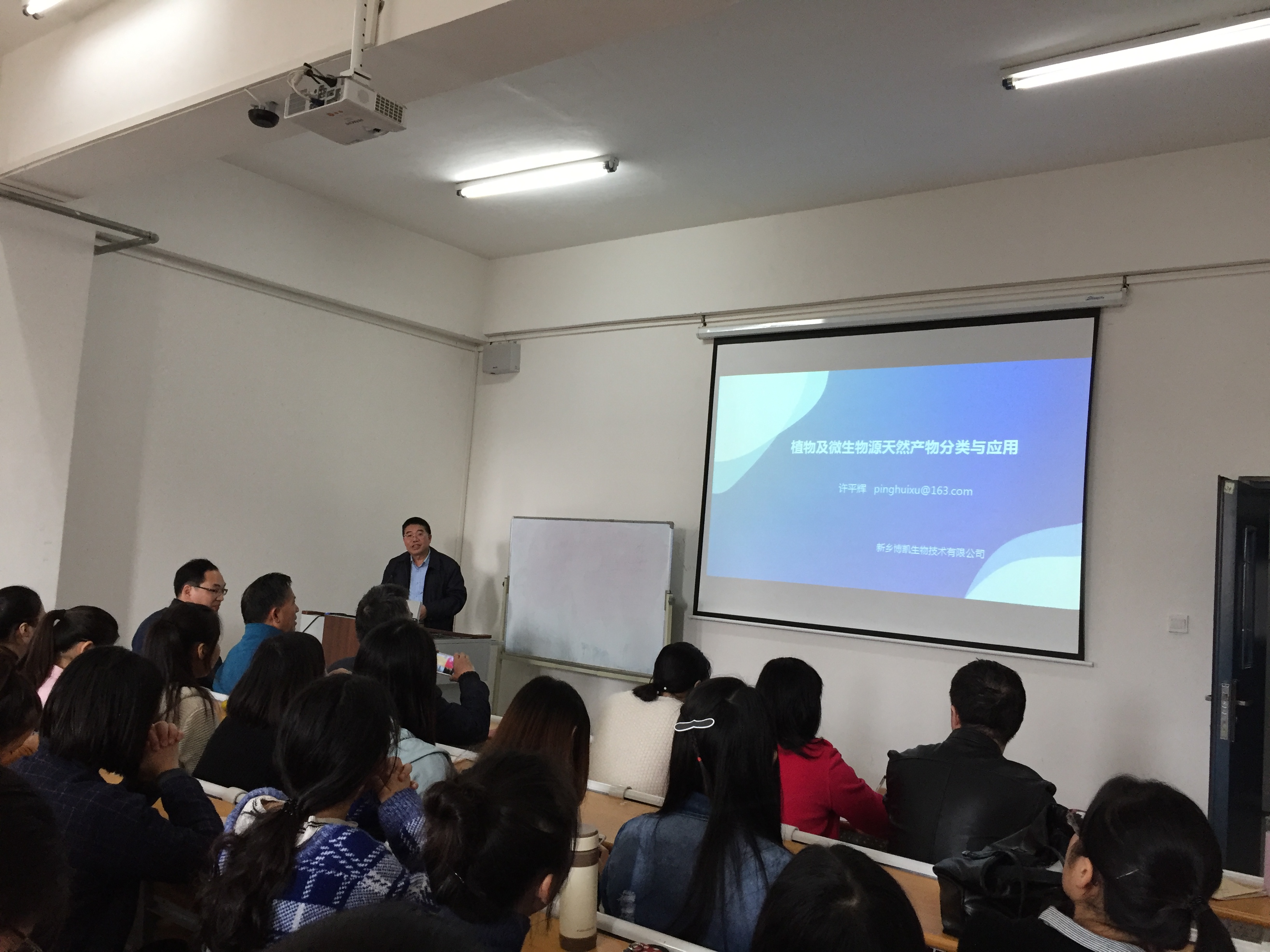 李明军教授和许平辉高级工程师对受聘为必赢兼职教授表示感谢,并分别以“豫产道地药材生物技术研究进展”和“植物及微生物源天然产物分类与应用”为题给必赢师生作了学术报告。李明军教授从中药材资源现状、豫产道地药材简介、种质资源的离体保存、种质资源遗传多样性分析等方面介绍了河南道地药材的现状及研究进展;许平辉高级工程师从植物源天然产物分类与应用、植物源天然产物提取工艺、微生物源天然产物分类与应用等方面介绍了天然产物的提取工艺与应用发展,并与师生亲切互动。