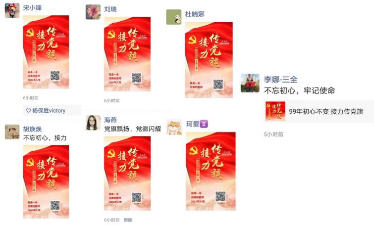 影片观看之后的线上传党旗接力活动将本次活动推向高潮,重温入党誓词,重温入党宣誓时的庄严承诺和坚定决心,在党旗下接受心灵的净化和洗礼,牢记初心使命,争当出彩先锋,以更加饱满的热情投身各自工作,在教书育人中切实发挥共产党员的先锋模范作用。