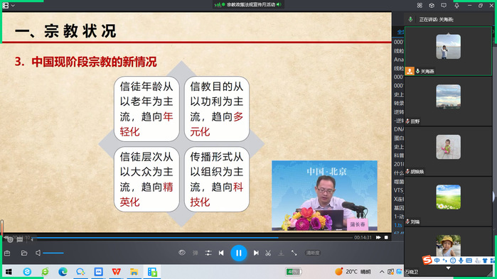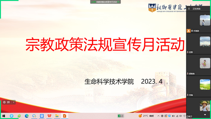 为深入学习贯彻党的二十大精神、习近平总书记关于加强和改进民族工作的重要思想、关于宗教工作重要论述和习近平法治思想,贯彻落实中央民族工作会议、全国宗教工作会议及省委民族工作会议、全省宗教工作会议精神,我总支按照学校《关于在全校开展筑牢中华民族共同体意识暨民族宗教政策法规宣传月活动的通知》开展了相应的宣传学习活动。4月26日中午,利用老师们休息的时间组织了线上专题培训,学习了我国的宗教信仰概况、如何看待宗教的影响等相关政策法规,通过学习老师们对我国的宗教情况有了更深入的了解,更有利于日后理性、正确地处理宗教相关问题。并且要求老师们在日常教学和交流中多利用微信、QQ等宣传中国特色社会主义民族宗教理论、宣传正确的、向上的民族宗教政策法规。