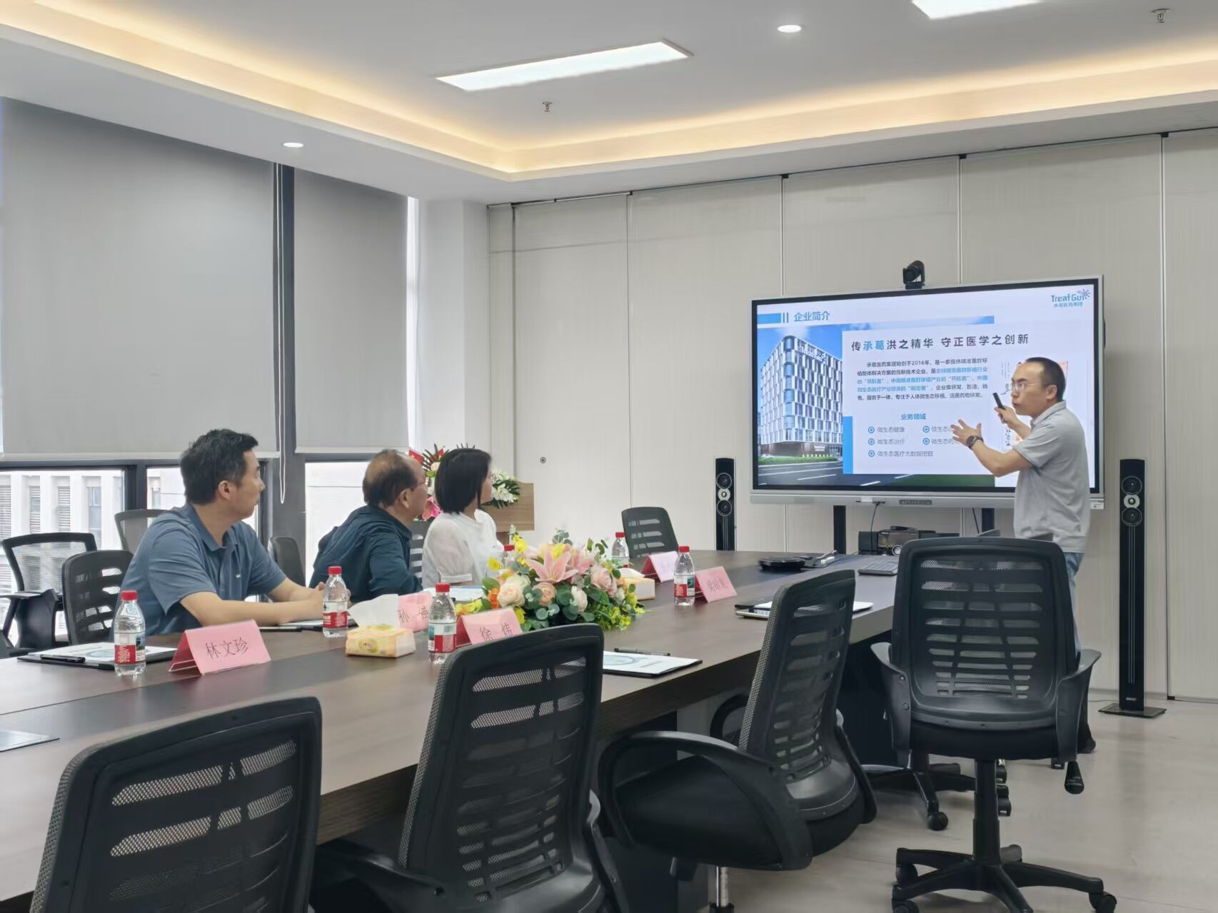 在锐杰天川生物科技公司,樊晋宇董事长首先介绍了公司的基本情况,涵盖主营业务、创新技术、市场前景以及对专业人才的需求等。他认为,校企合作是企业发展与人才培养的双赢战略,公司将充分发挥自身产业优势,为学生提供优质的实习岗位和实践指导,助力学生将理论知识与实际操作紧密结合,提升专业技能和职业素养,同时也希望借助学校的人才和学科优势,推动企业技术创新和产业升级。