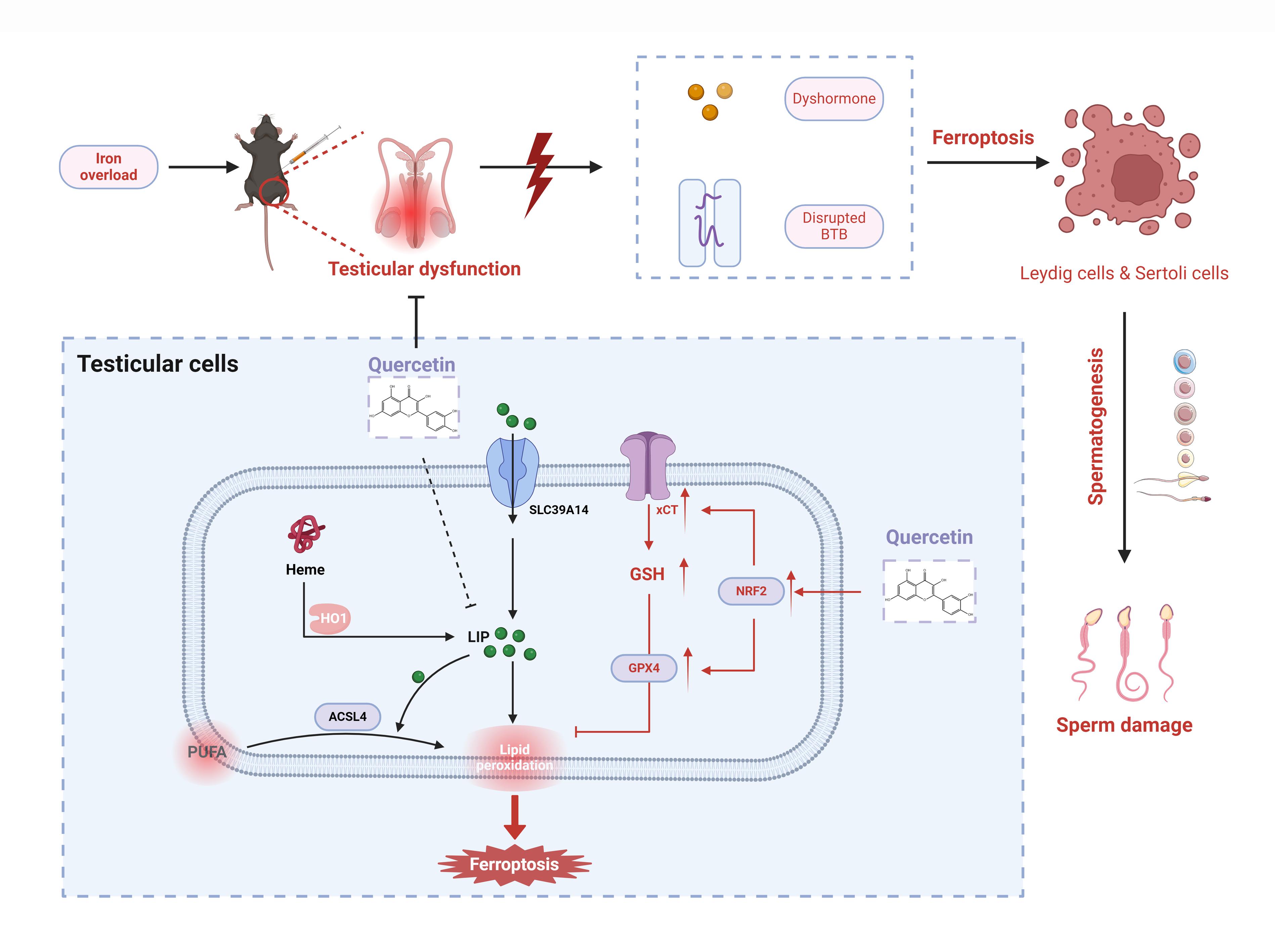 该研究聚焦铁超载引发的睾丸功能损伤难题,通过体内外实验证实,天然黄酮类化合物槲皮素可通过激活 NRF2 信号通路,抑制铁死亡关键蛋白 SLC7A11 和 HO1,恢复谷胱甘肽抗氧化系统,从而减轻铁超载导致的睾丸组织氧化应激、线粒体损伤和血睾屏障破坏。实验表明,槲皮素能显著改善铁超载小鼠的精子活力、睾酮水平及睾丸组织结构,为临床治疗铁代谢异常相关男性不育提供了新方向。
