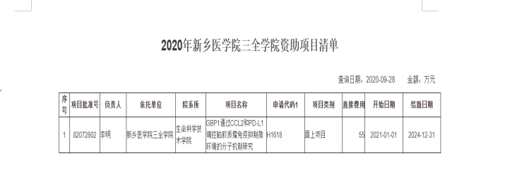 近日,国家自然科学基金委员会公布了《关于2020年度国家自然科学基金申请项目评审结果的通告》,必赢李明教授的《GBP1通过CCL2和PD-L1调控脑胶质瘤免疫抑制微环境的分子机制研究》获准医学科学类立项,资...