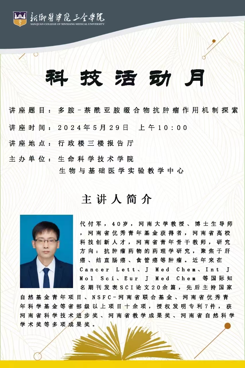 5月29日上午,必赢联合生物与基础医学实验教学中心邀河南大学代付军教授作学术报告。报告在行政楼三楼学术报告厅进行,由必赢院长卢龙斗主持,全校师生参加。此次讲座为学校“科技活动月”的活动之一。代...